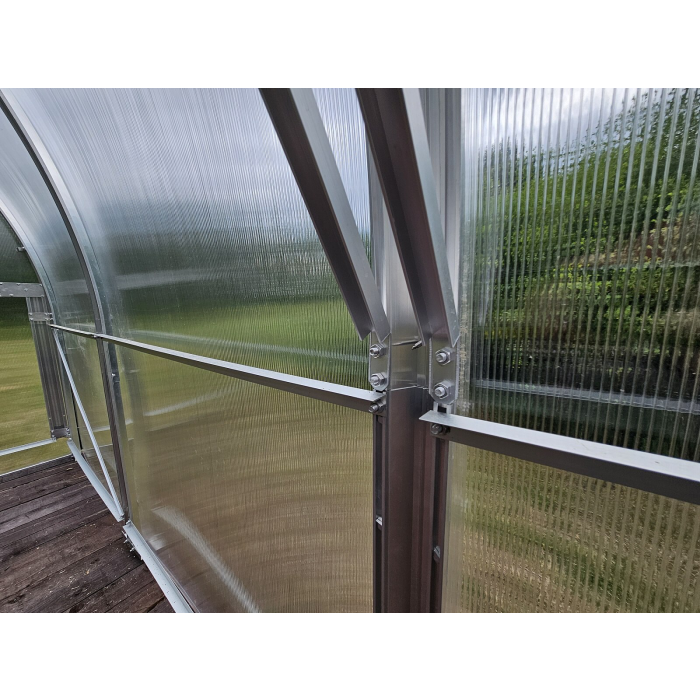 Konštrukcia skleníka je zoskrutkovaná zo silných hliníkových profilov (masívny 1 mm hrubý a 65 mm široký eloxovaný hliníkový profil) a doplnená prémiovým komôrkovým polykarbonátom s UV filtrom od britskej firmy BRETT MARTIN s predĺženou zmluvnou zárukou 10 rokov na nerozbitnosť polykarbonátu. Táto kombinácia robí zo skleníkov radu VITAVIA BOHEMY jeden najkvalitnejších a súčasne na montáž najjednoduchších skleníkov na slovenskom trhu. Jednotlivé profily sa vzájomne zoskrutkujú a po ich zostavení vznikne veľmi stabilná oblúková konštrukcia bez nutnosti stavby skleníkovej podmurovky. Skleník je vybavený kotvami priamo do zeme. Montáž skleníka zvládnete svojpomocne v dvoch až troch osobách. V pôde sa záhradný skleník upevňuje zakopávaním pätiek konštrukcie do zeme, prípadne ich zaliatím do betónu (odporúčame).