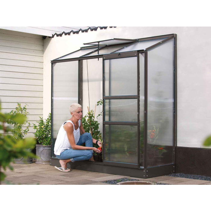 Hliníkový skleník k stene, š 1,93 x d 0,69 m, čierna farba, 1x str. okno, polykarbonát 4 mm, plocha 1,33 m2.