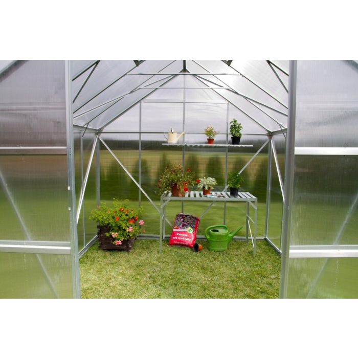 Obsahom balenia sú dvojkrídlové posuvné dvere (š x v otvoru = 122 x 191 cm), AL profily, presklenie, 4x strešné ventilačné okno s manuálnym otváraním, všetok spojovací materiál + pozinkovaná základňa. Ku skleníku je možné dokúpiť množstvo nadštandardného príslušenstva - poličky, regály, ďalšie vetracie strešné i bočné okienka, automatické otvárače k týmto okienkam, odkvapové sady, teplomery, vlhkomery, zavlažovacie zariadenia, elektrické odporové vykurovanie pôdy.