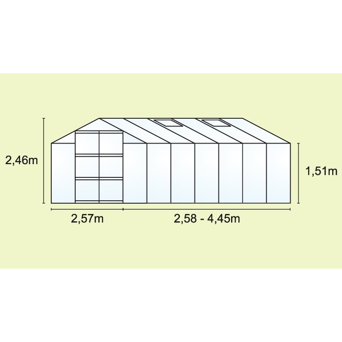 Hliníkový skleník, š 257 x d 321 cm, zelená farba, 4x str. okno, polykarbonát 6 mm, plocha 8,25 m2.