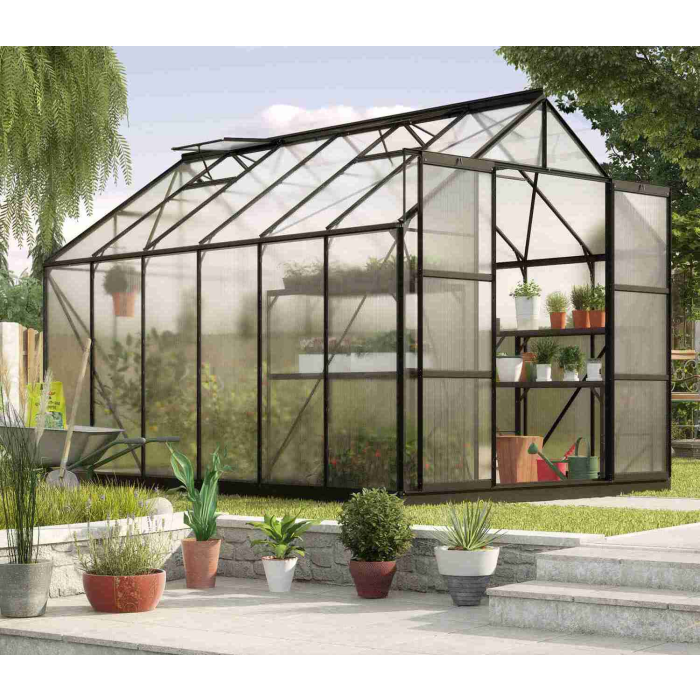 Hliníkový skleník, š 2,57 x d 3,83 m, čierna farba, 4x str. okno, polykarbonát 6 mm, plocha 9,84 m2.