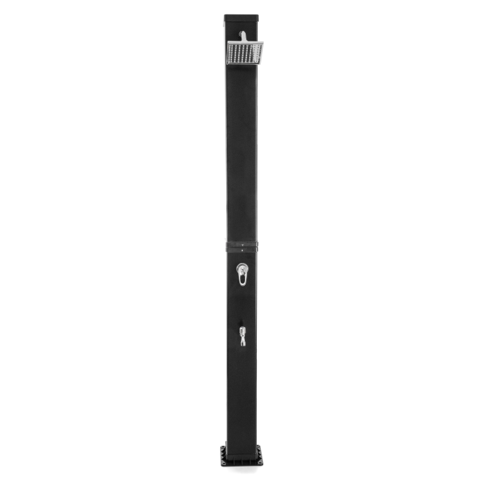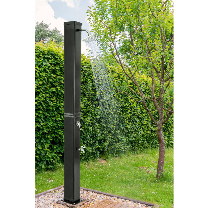 Telo sprchy v elegantnej čiernej farbe slúži zároveň ako solárny kolektor - absorbuje slnečné lúče a ohrieva vodu bez potreby elektriny či plynu. Keď si doprajete sprchu pred plávaním, ochránite vodu v bazéne pred zbytočným znečistením. Tým si výrazne uľahčíte jeho údržbu.
