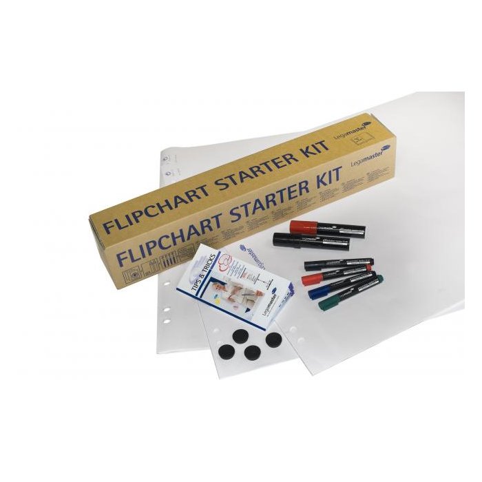 obsahujúca 3 flipchartové 20 listové bloky, 2 popisovače TZ 48 v čiernej a červenej farbe, sadu 4 popisovačov TZ 41 v základných farbách, 4 magnety priemeru 30 mm a brožúrku s tipmi, ako napr. používať príslušenstvo v kombinácii s typom zakúpeného flipchartu, ako kresliť grafy so špeciálnymi popisovačmi Legamaster tak, aby boli jasné a čisté a ako efektívne využívať flipchartové bloky.