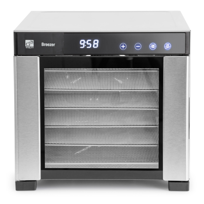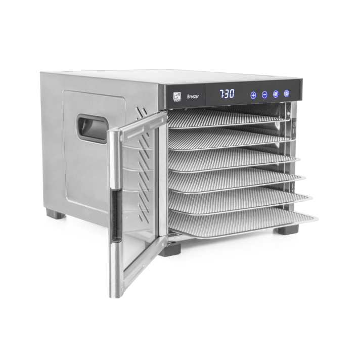 Horizontálna sušička potravín G21 Breezer je menšou sestrou sušičky G21 Mistral. So svojimi 6 nerezovými sušiacimi podnosmi a 6 jemnými sušiacimi vložkami je vďaka kompaktnejšiemu prevedeniu ideálna pre domáce použitie alebo do prevádzok s menšou pracovnou plochou. Všetko ovocie, zeleninu, bylinky, huby aj mäso usuší dokonale, rovnomerne a jednoducho. Nemusíte preskladávať plata ani otáčať suroviny. Dokonca sa nemusíte zaoberať ani údržbou sušičky, vďaka použitým materiálom je odolná a ľahko sa čistí.
