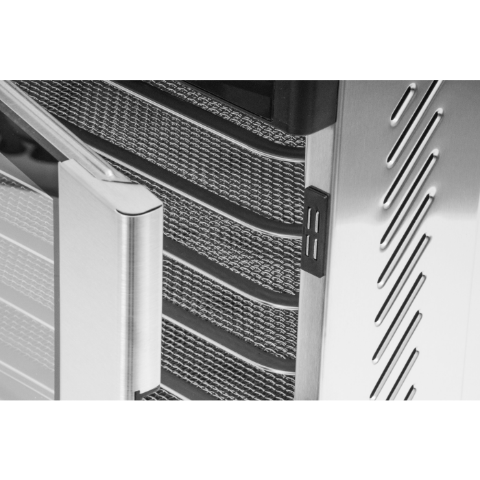 Sušička potravín G21 Breezer má na rozdiel od bežných sušičiek tiež nerezové dvierka, ktoré zabezpečujú nižšiu spotrebu energie, dokonalú cirkuláciu vzduchu, efektívnejšie sušenie a skracujú dobu sušenia potravín. Aby ste dvierka v priebehu sušenia nemuseli otvárať a do sušičky sa tak nedostal chladný vzduch, vybavili sme ich okienkom. Ľahko a rýchlo tak zistíte stav sušeného ovocia, zeleniny, byliniek, húb alebo mäsa. Vďaka dvierkam môžete tiež vyňať ľubovoľný počet plát a sušiť na menšom počte bez obáv z narušenia kvality sušenia.