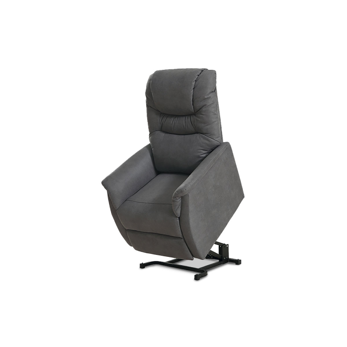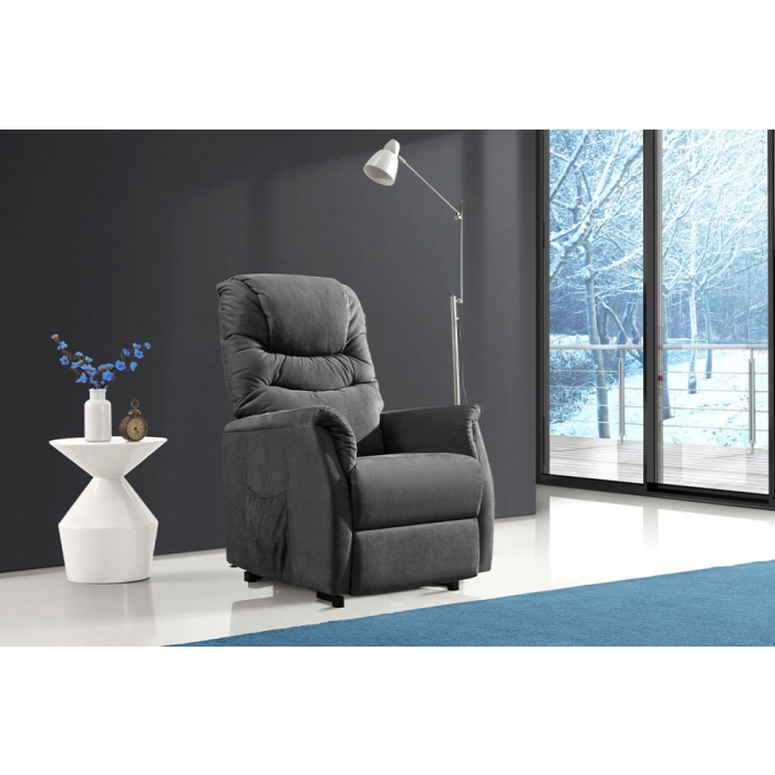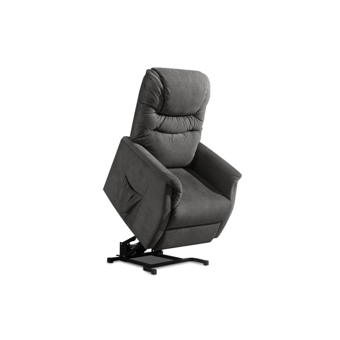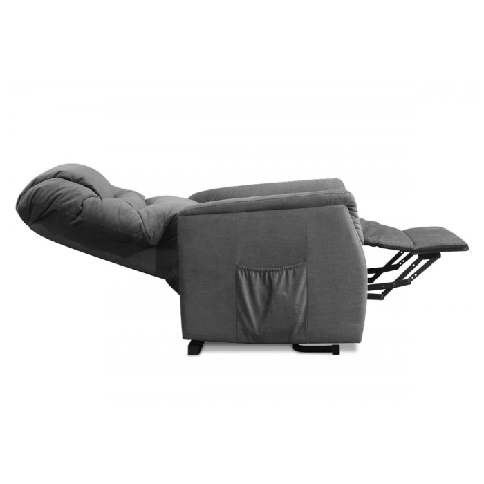 Potah je s šedé látky. Kostra z masivního dřeva, boky jsou z topolové překližky. Mechanická konstrukce je kovová, lakovaná černým práškovým lakem. Výplň z PU pěny 28D na sedáku. Ten je navíc zpevněn a zesílen kapesními ocelovými pružinami a polyesterovým vláknem Dacron. Opěrák je vyplněn dutým silikonizovaným vláknem, opěrky 24D PU pěnou. To vše zaručuje skvělé pohodlí a maximální relaxaci. Dva integrované motory a čtyřtlačítkové kabelové ovládání pomáhají nejen při vstávání, ale i nastavení všech relaxačních poloh jednotlivě. Ovladač je umístěn v praktické a velké kapse na pravé straně křesla. Tu můžete využít i jiným způsobem, například jí naplnit bonbóny a postupně je odebírat při chvilkách zasloužené relaxace a odpočinku. Úplný rozklad zvládne nezatížené křeslo 15 sekund, polohu Relax I (zvýšená podnožka) za 9 sekund, úplný výklop za 18 sekund. Výška pohodlných područek je 64 cm, šíře 13 cm a světlá výška křesla je 6 cm. Křeslo se dá rozložit na plochu lůžka téměř 180° a velikosti 178 x 50 cm. Nosnost je až 140 kg. Toto křeslo si po prvním dosednutí a dolehnutí nejen zamilujete, ale stane se právoplatným a nepostradatelným členem Vaší domácnosti.