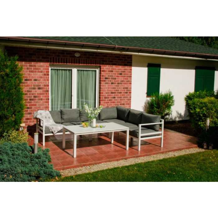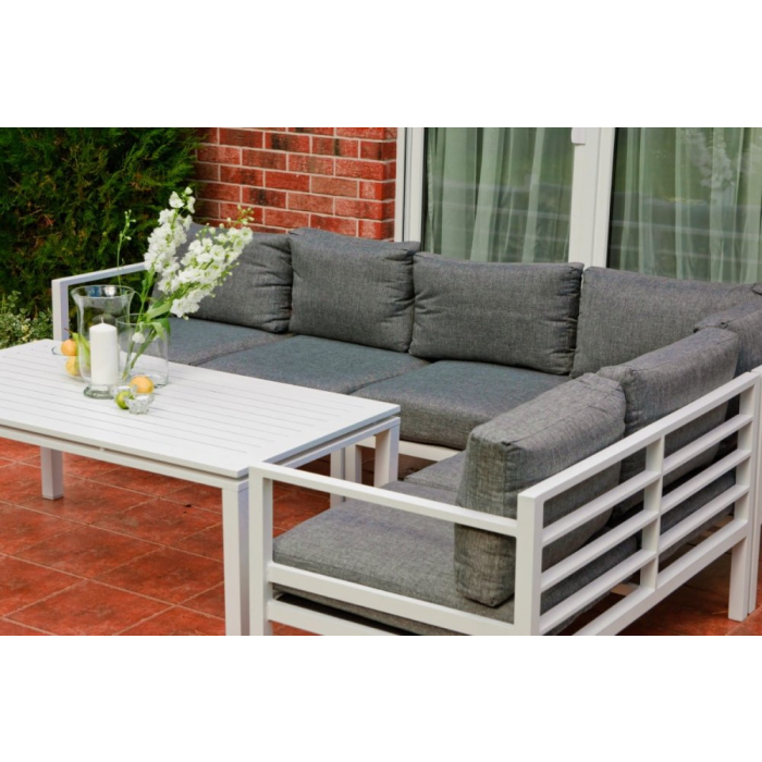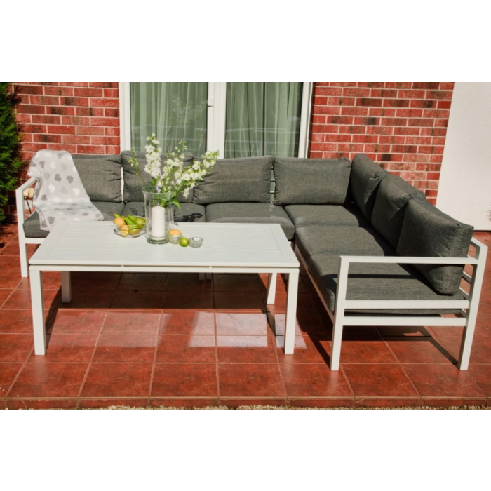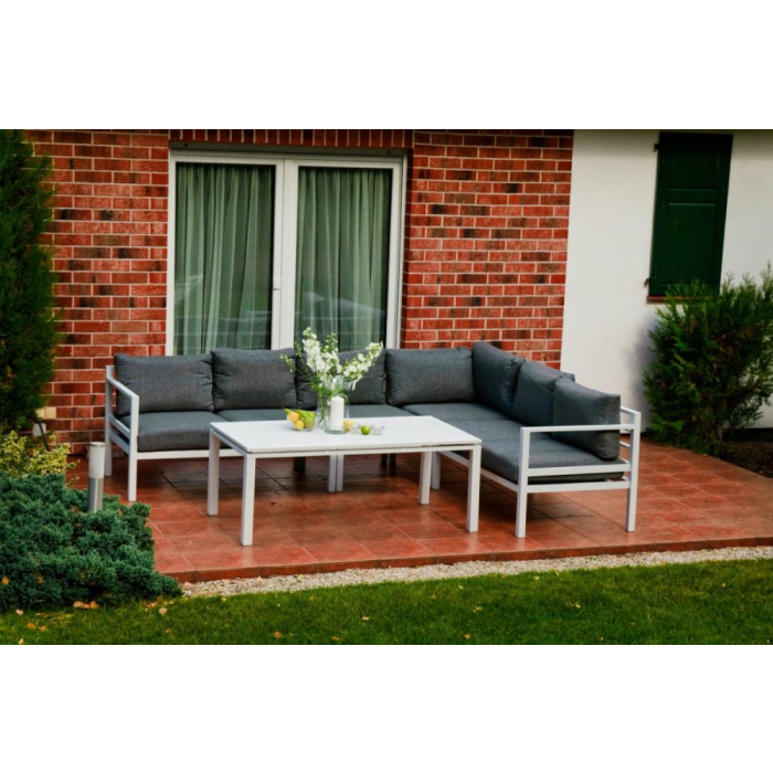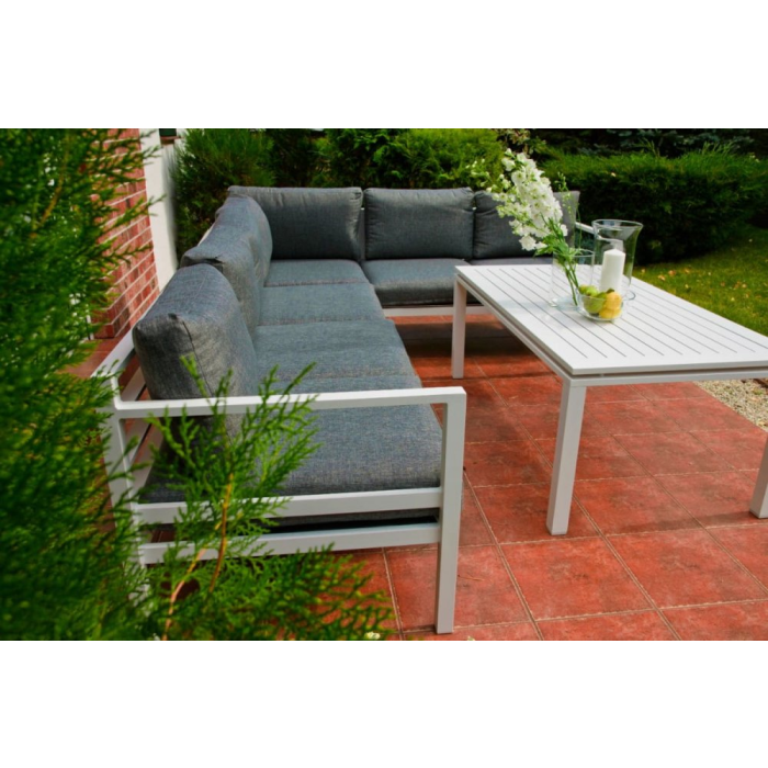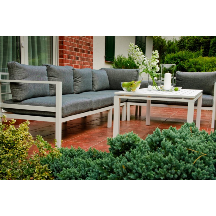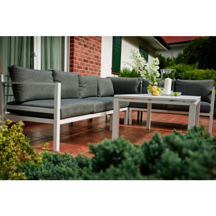 Vyrobené z ľahkej hliníkovej konštrukcie, bude vynikajúce v každej domácej záhrade. Vďaka jasným farbám je sada vhodná pre takmer každé usporiadanie. Biely rám (s práškovým poťahom) a sivé vankúše navzájom dokonale ladia a vytvárajú elegantnú a klasickú súpravu. Ideálne pre stretnutia so svojimi blízkymi. Praktický konferenčný stolík je ďalšou výhodou. Modulárna konštrukcia súpravy ALLUMINIO GRANDE vám umožňuje zariadiť nábytok podľa vašej vlastnej koncepcie. Jediným limitom je vaša fantázia. Farba súpravy ALLUMINIO GRANDE: biela Farba vankúšov: šedá Dizajn nábytku: hliník