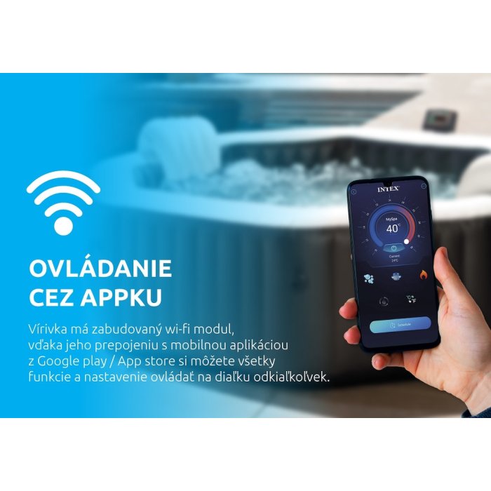 Vírivka má zabudovaný Wi-Fi modul, vďaka ktorého prepojeniu s mobilnou aplikáciou z Google play / App store môžete ovládať všetky funkcie a nastavenia na diaľku odkiaľkoľvek. Dokonalý relaxačný kúpeľ si môžete pripraviť ešte pred príchodom.