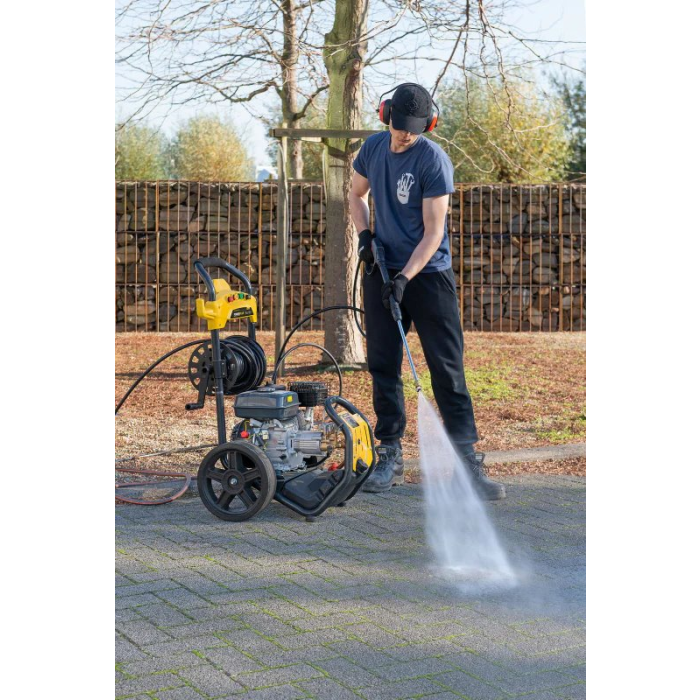 Vzhľadom k 3-litrovej benzínovej nádrži nie sú potrebné otravné predlžovacie káble. 20 metrov dlhá tlaková hadica poskytuje potrebnú voľnosť pohybu. Okrem toho je tlaková umývačka pripevnená na robustnom podvozku s dvoma kolesami, takže ju je možné ľahko prepravovať.