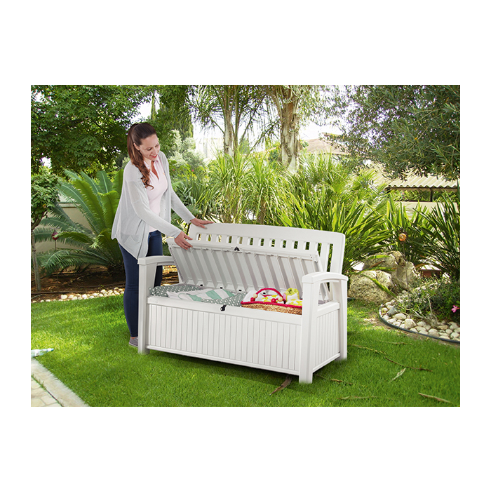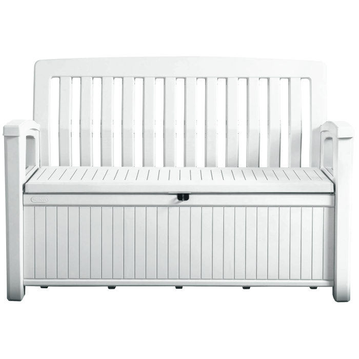 Záhradná lavička s uzamykateľným úložným priestorom s objemom 227 l, biela farba, povrch imitujúci drevo. Odolnosť voči UV žiareniu a poveternostným podmienkam, jednoduchá montáž a jednoduchá údržba. 2miestna, nosnosť 2 x 110 kg. Kvalitná a pohodlná.