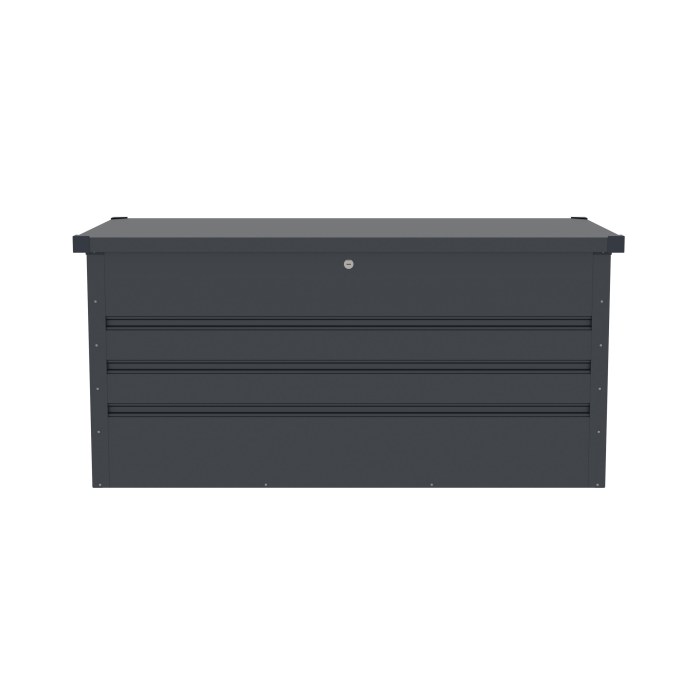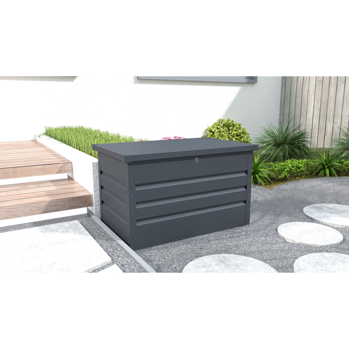 Bezúdržbový uzamykateľný záhradný box z pozinkovanej ocele bezpečne ochráni uložené záhradné náradie aj vybavenie. Rozmer 99 x 61 x 58 cm, ľahké otváranie veka vďaka plynovým vzperám, zámok aj kľúče súčasťou balenia.