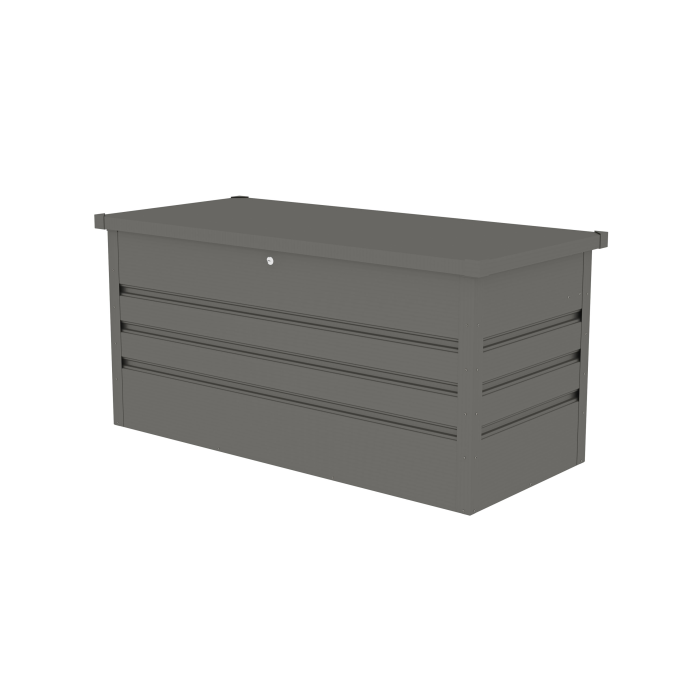 Bezúdržbový uzamykateľný záhradný box z pozinkovanej ocele bezpečne ochráni uložené záhradné náradie aj vybavenie. Rozmer 132 x 61 x 62 cm, ľahké otváranie veka vďaka plynovým vzperám, zámok aj kľúče súčasťou balenia.