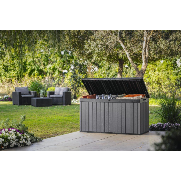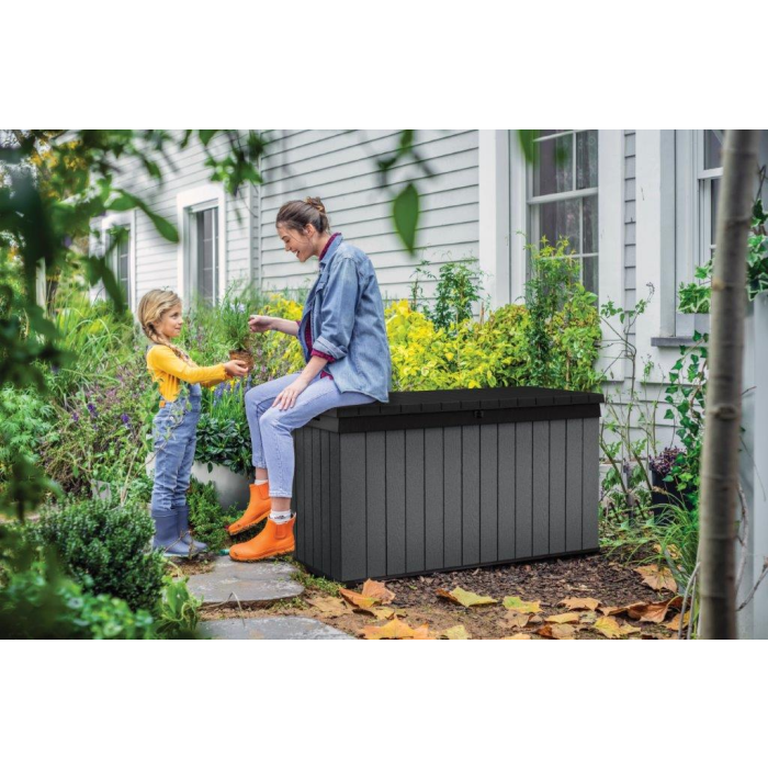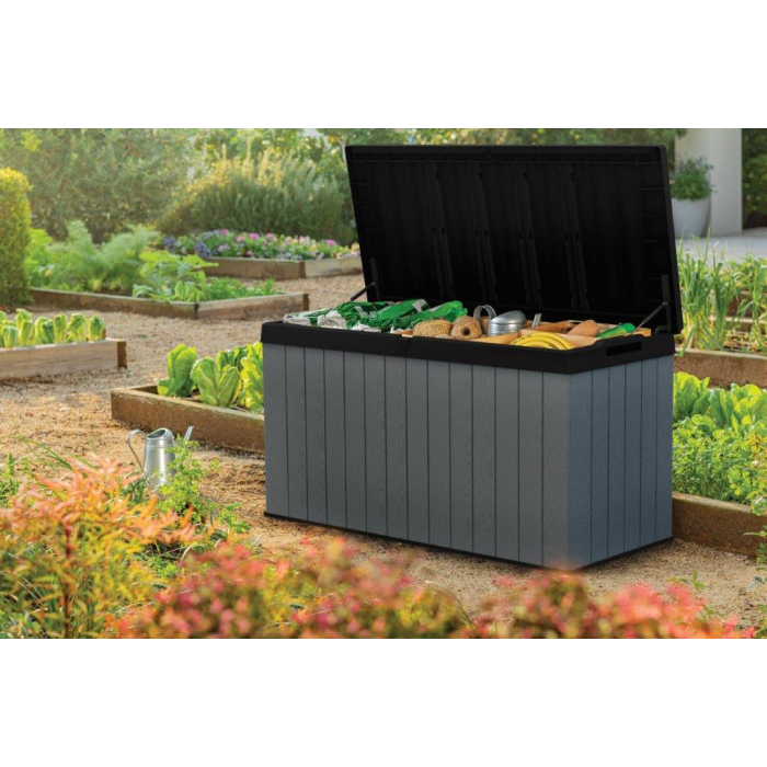 Nájdite pre box ideálne miesto na záhrade. Vďaka štruktúre, ktorá pripomína drevo, zapadne do každého prostredia. Uložené veci navyše môžete uzamknúť vo vnútri boxu. Hydraulický piestový systém zaistí plynulé a bezpečné zatváranie a otváranie veka. Po zatvorení sa na neho navyše usadí až 2 ľudí.