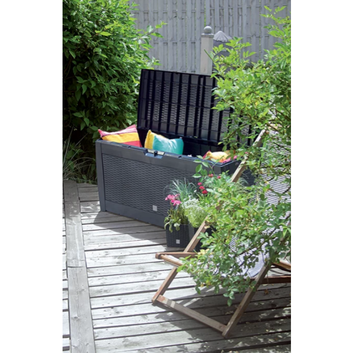 Záhradný box s objemom 310 l. Dizajn pripomína ratan. Ideálny na záhradu, do pergoly či na balkón. Veko v hornej časti. Madlá pre ľahkú manipuláciu. Jednoduchá montáž boxu bez použitia náradia.