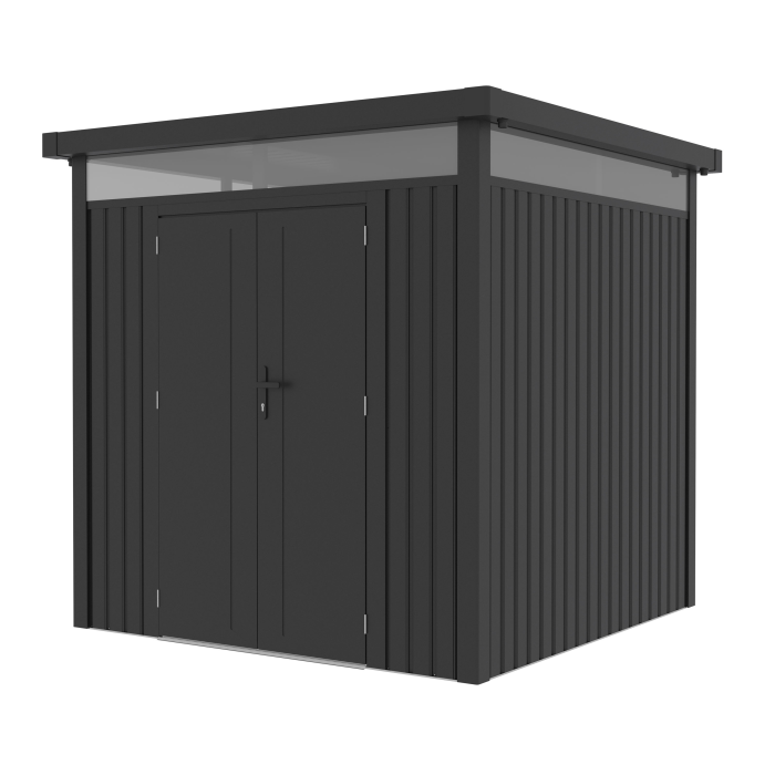 Plechový záhradný domček so silou steny 0,4 mm, priechodná výška je 178 cm. Polykarbonátové svetlíky, otvárateľné okno, strecha s odkvapmi, bridlicová farba.