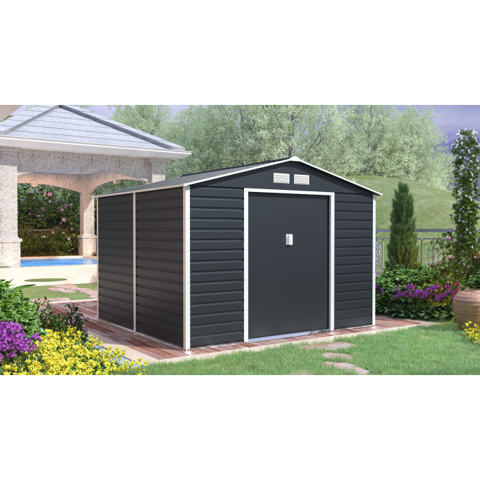 Záhradné domčeky na náradie v modernom dizajne sa hodia do každej záhrady. Vstupné dvere sú dostatočne široké, preto do domčeka pohodlne uložíte svoje náradie, záhradný fúrik aj vonkajší nábytok.
