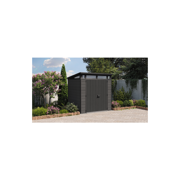 Uzamykateľný a bezúdržbový domček na skladovanie záhradných, dielenských a športových potrieb, podlahový panel a strecha s nosnosťou až 200 kg/m2, patentovaný materiál Evotech a oceľová výstuž. Grafitová.