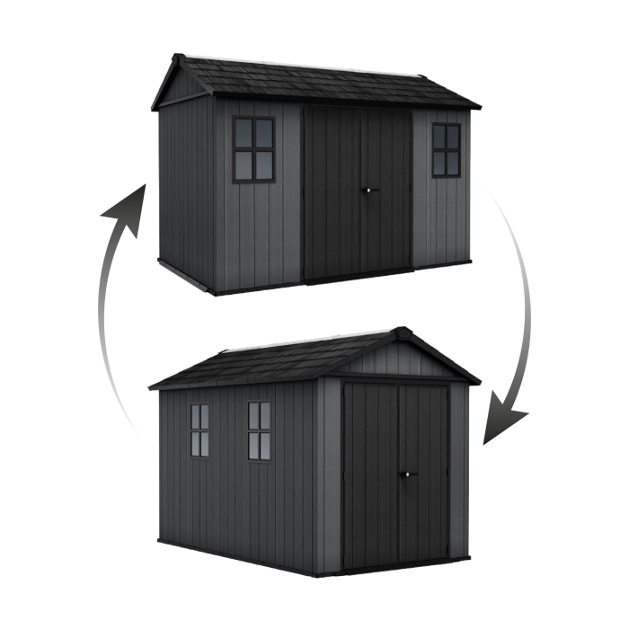 Domček zostavíte 2 rôznymi spôsobmi podľa svojich vlastných predstáv. Záleží len na vás, na akú stranu umiestnite dvere a okná. Do interiéru navyše ľahko namontujete skrine, knižnice alebo police na náradie. Tým rozšírite úložný priestor záhradného domčeka.