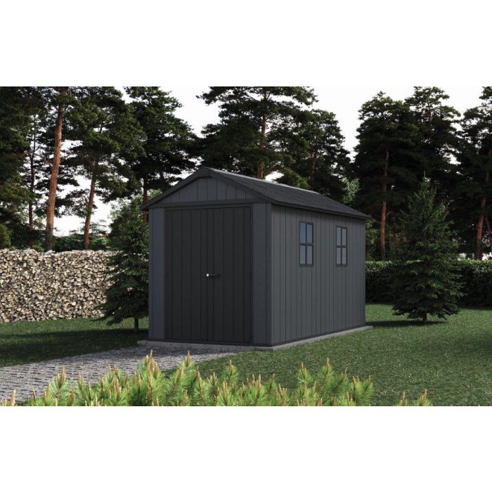 Záhradný domček na skladovanie záhradného, ??dielenského náčinia a ďalšieho vybavenia, 2 možnosti zostavenia, 2,3 x 2,46 x 3,5 m, sedlová strecha a podlahový panel pre zaťaženie až 150 kg/m2, dvojité steny, okienka. Materiál Evotech. Tmavosivá farba.