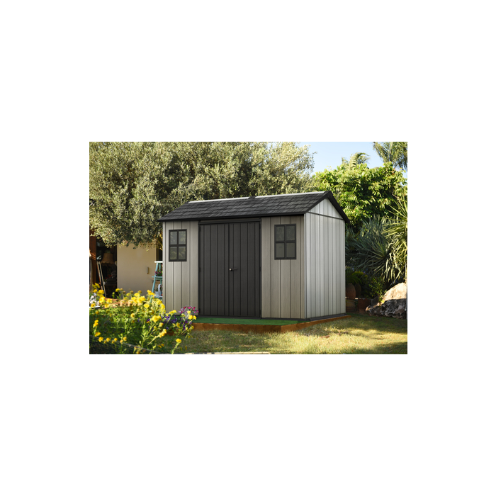 Záhradný domček na skladovanie záhradného i dielenského náradia a ďalšieho vybavenia, 3,50 x 2,54 x 2,29 m, sedlová strecha vydrží zaťaženie až do 100 kg/m2. Dvojité steny, dvojité okná. Kompozit Duotech, polypropylén. Šedá a antracitová farba.