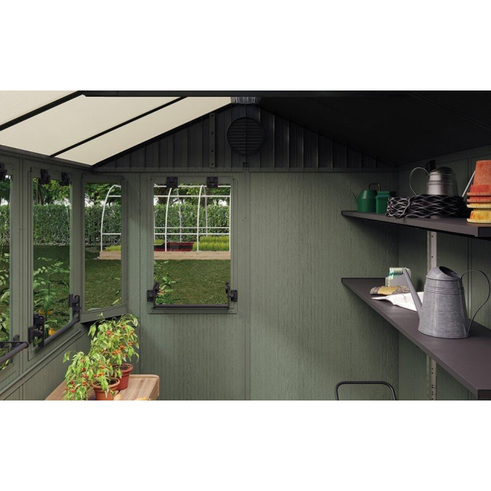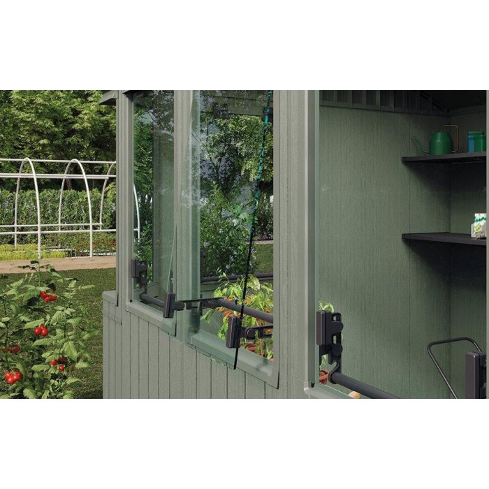 Chcete v domčeku rozšíriť úložný priestor? Namontujte dovnútra 2 police (sú súčasťou balenia). Uskladníte na ne drobnejšie pomôcky a predmety.Okrem toho kedykoľvek vyvetráte. O cirkuláciu vzduchu sa postará celkom 5 okien (s možnosťou otvorenia na 7°).