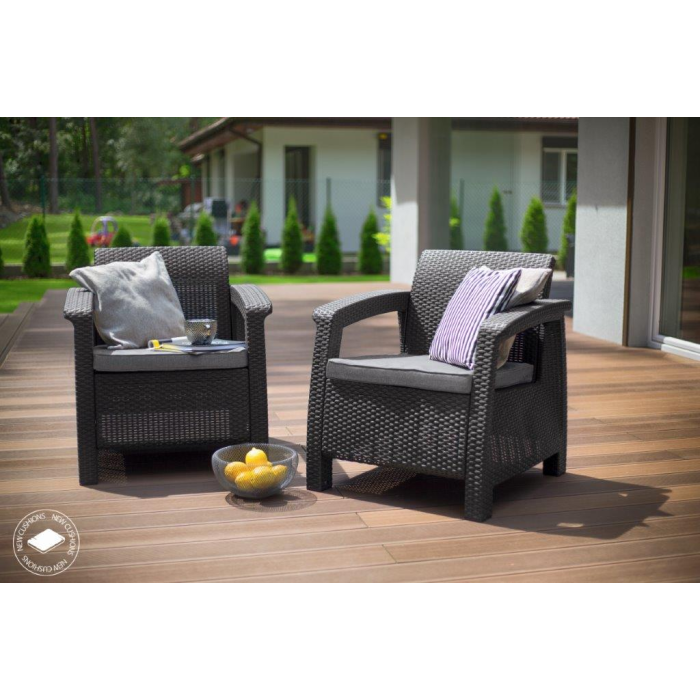 2 kusy záhradných kresiel Corfu v grafitovej farbe z najobľúbenejšieho radu nábytku od Keteru vás nadchnú svojim nevšedným dizajnom v imitácii prírodného ratanu. Konštrukcia je pritom pevná a vydrží bežné zaťaženie vonkajšej prevádzky.