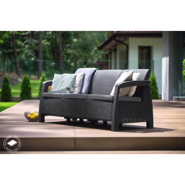Záhradná trojmiestna pohovka z radu Corfu je najobľúbenejšia z radu nábytku Keter, ktorá vás nadchne svojim nevšedným dizajnom v imitácii prírodného ratanu. Konštrukcia je pritom pevná a vydrží bežné zaťaženie vonkajšej prevádzky.