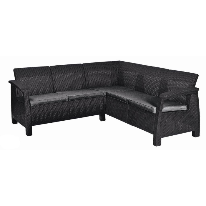 Záhradná päťmiestna rohová pohovka Corfu najobľúbenejšieho radu nábytku od Keteru v grafitovej farbe vás nadchne svojim nevšedným dizajnom v imitácii prírodného ratanu. Konštrukcia je pritom pevná a vydrží bežné zaťaženie vonkajšej prevádzky.