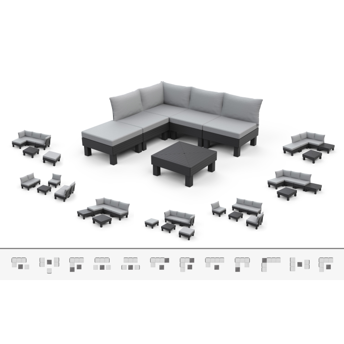 Modulárny set vám poskytne veľké množstvo spôsobov, ako nábytok zostaviť. Záleží na vašich možnostiach a predstavivosti. Počas chvíle zmeníte rozmiestnenie operadiel alebo základov s nožičkami. Vytvoríte samostatné kresielka, 5-miestnu sedačku alebo jeden zo základov využijete ako odkladací stolík.