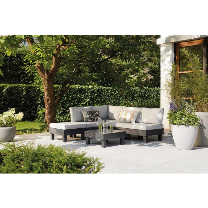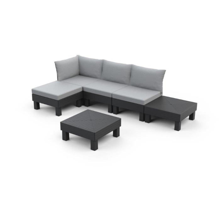 Modulárny set, 5 miest na sedenie, odolnosť voči UV žiareniu a poveternostným podmienkam, vysoké podsedáky so spodnou protišmykovou úpravou pre väčšie pohodlie, jednoduchá údržba aj montáž.