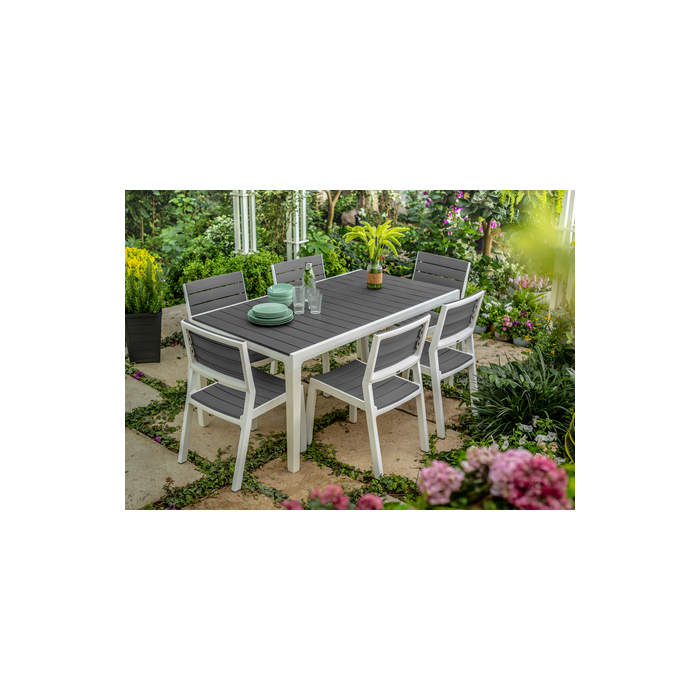 Harmony stôl s bielym rámom a šedými doskami pripomínajúcimi drevo tvoria dokonalý pár s pohodlnými stoličkami rovnakej rady. Nekov. rám je odolný voči hrdzi a je zárukou ľahkej údržby. Konštrukcia z umelej živice. Bielo-šedá farba.