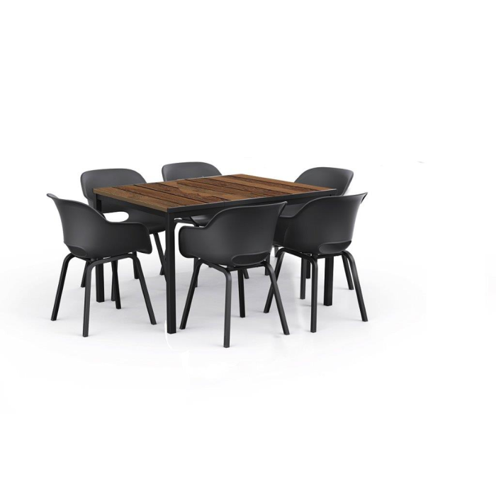 Záhradný stôl pre 6 ľudí, odolná konštrukcia, unikátny povrch DecoCoat – odolnosť voči poveternostným vplyvom a poškriabaniu, design pripomína skutočné drevo.
