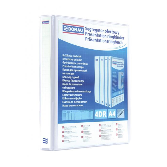 4-krúžkový celoplastový zakladač A4 s D-krúžkom, predným, zadným a chrbtovým priehľadným vreckom.