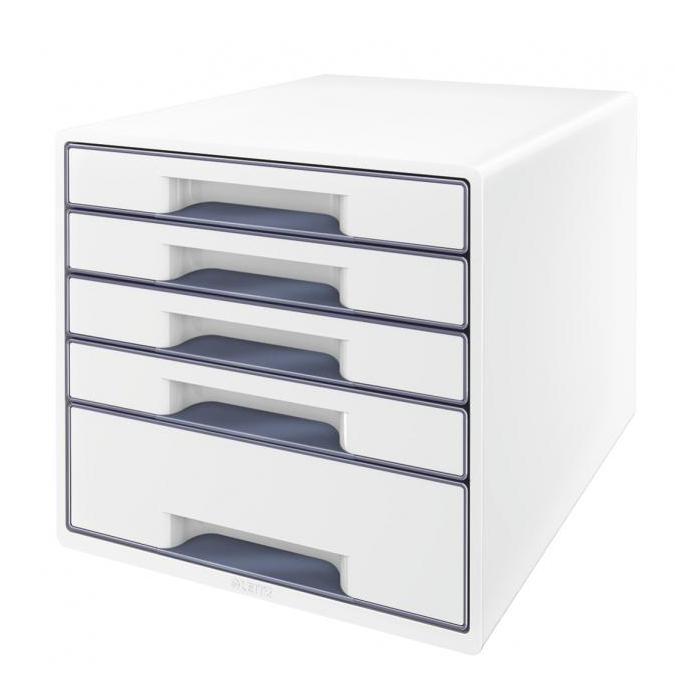 Ľahko vysúvateľné 4 malé a 1 veľká zásuvka so zarážkou proti úplnému vysunutiu, jednoduché otváranie a zatváranie. Gumové nožičky pre lepšiu stabilitu, rozlišovač na popis zásuvky. Rozmery 287 × 270 × 363 mm. Farba perleťovo biela.