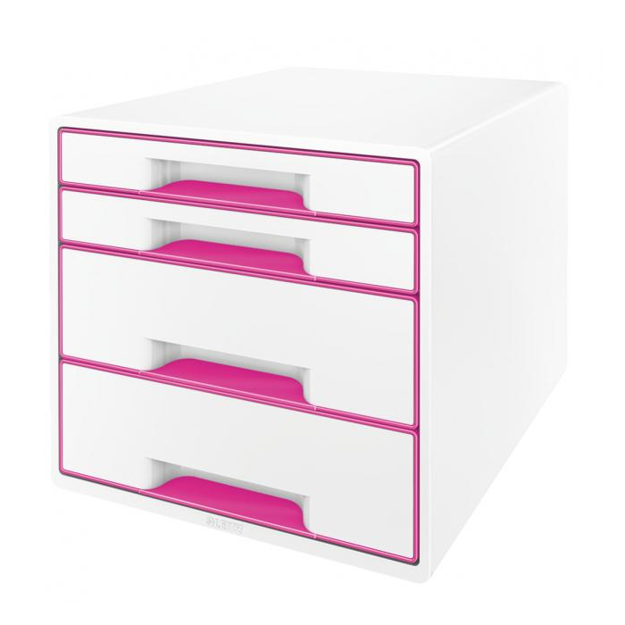 Ľahko vysúvateľné 2 malé a 2 veľké zásuvky so zarážkou proti úplnému vysunutiu, jednoduché otváranie a zatváranie. Gumové nožičky pre lepšiu stabilitu, rozlišovač na popis zásuvky. Rozmery 287 × 270 × 363 mm. Farba ružová.